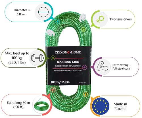 ZIXXONE-HOME Filo Stendibiancheria 60 m con 2 tenditori Corda con anima in acciaio Resistente extra forte lunge da giardino campeggio e casa Filo di ricambio asciugatrici Verde Chiaro Made in EU
