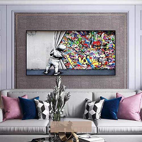 ZMFBHFBH Banksy Art Boy Behind Curtains Graffiti Canvas Painting Poster Print Street Pop Art Immagine da parete per Kids Room Decor 85x170cm (33x67in) con cornice