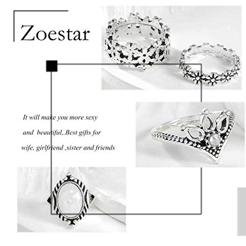 Zoestar - Set di anelli stravaganti, argentati, con opale e strass, vintage, per dita e nocche, impilabili, cavi, incisi, da donna e ragazza, a luna e a corona (confezione da 10)