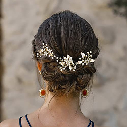 Zoestar Spille per capelli da sposa con perle e foglie, accessori per capelli da sposa per donne e ragazze, confezione da 3 (oro)