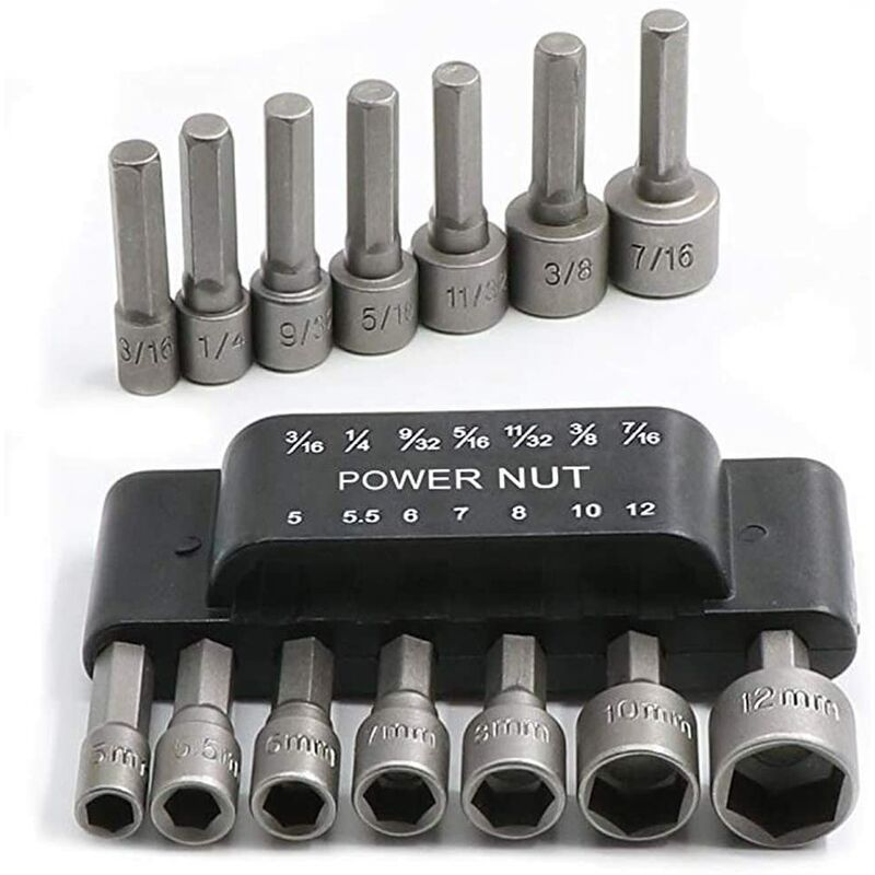 ZOJI Rendi la vita migliore! Specifiche: Materiale: acciaio al cromo vanadio Forma del fusto: esagonale. Diametro gambo: 1/4 Contenuto della confezione: 14 inserti esagonali Contiene: 3/16 (4,76 mm),1/4 (6,35 mm),9/32 (7,14 mm),5/16 (7,93 mm),11/32 (8,73 mm),3/8(9,53 mm),7/16 (11,11 mm), 5 mm, 5,5 mm, 6 mm, 7 mm, 8 mm, 10 mm, 12 mm. Design del prodotto: 1. Realizzato in acciaio al cromo vanadio di alta qualità. 2. Superficie sabbiata, forte resistenza alla ruggine e alla corrosione. 3. Il trattamento Quench ad alta temperatura migliora la durata e la durata. 4. Manico esagonale, 1/4 adatto alla maggior parte delle persone. Trapano motorizzato cablato o senza fili. 5. Facile da installare e smontare, non è un semplice Caduta durante l'uso. Molteplici applicazioni: 1. Adatto per fai da te, lavorazione del legno, parti di auto, Riparazione professionale di macchine, ecc. 2. Ampiamente usato in questi strumenti esagonali come Cacciavite pneumatico, avvitatore elettrico, trapano ad aria