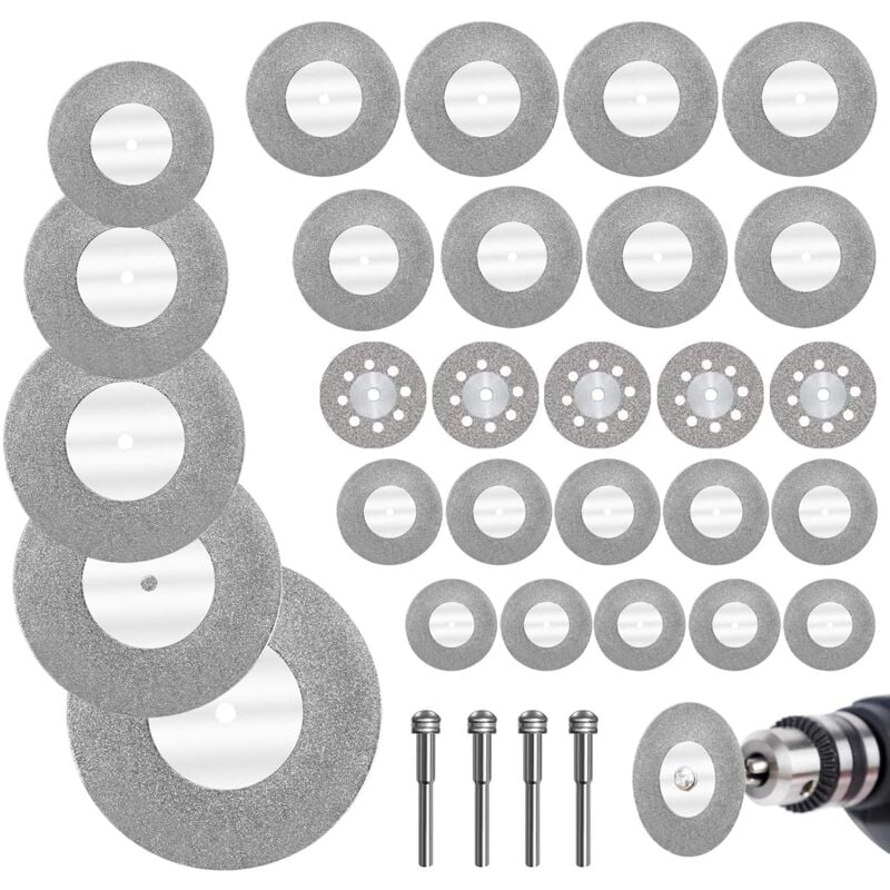 Materiali di alta qualità: il mini disco diamantato è realizzato in lega, con uno strato di corindone, che ha un'eccellente durezza, più durevole di altre lame da taglio. Adatto per operazioni di precisione: questo disco diamantato è di piccole dimensioni e taglia più velocemente, può rendere la superficie di taglio liscia e priva di sbavature per eseguire operazioni di precisione, in particolare per spazi ristretti e tagli sottili. ras. Disco diamantato da 22 mm con foro di sfiato: il pi' ha fori per l'aria, utili per eliminare i detriti e raffreddare e ridurre efficacemente l'usura del pezzo tagliente. Alta compatibilità: questo kit include 8 diverse dimensioni di dischi da taglio in ceramica (16, 20, 22, 25, 30, 40, 50, 60 mm) e 4 mandrini (3,2 mm), compatibili con la maggior parte degli utensili rotanti, come Silverline, GMC, Tacklife, Intertek Mini Grinder, B& D. Applicazioni: Disco diamantato La taglierina può tagliare metallo, piastrelle, marmo, ceramica, vetro, legno, pietre