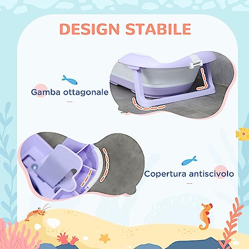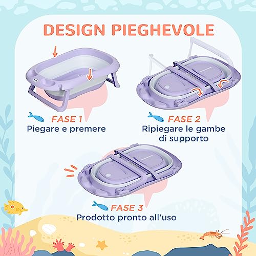 ZONEKIZ Vaschetta Bagnetto Pieghevole per Bambini 0-6 Anni con Cuscino e 2 Spazi Portaoggetti Inclusi, 83x48x23.5 cm, Viola e Bianco