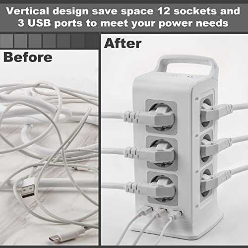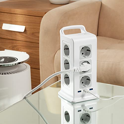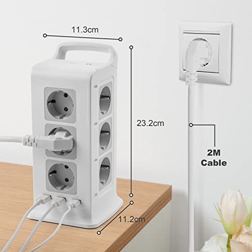 ZOVCAL Ciabatta Multipresa con USB, Multipresa Verticale con 12 Prese e 3 USB, Multipresa Elettrica Protezione Sovratensione, Ciabatta Elettrica con Cavo 2M e Interruttore, Multipresa Schuko 4000W