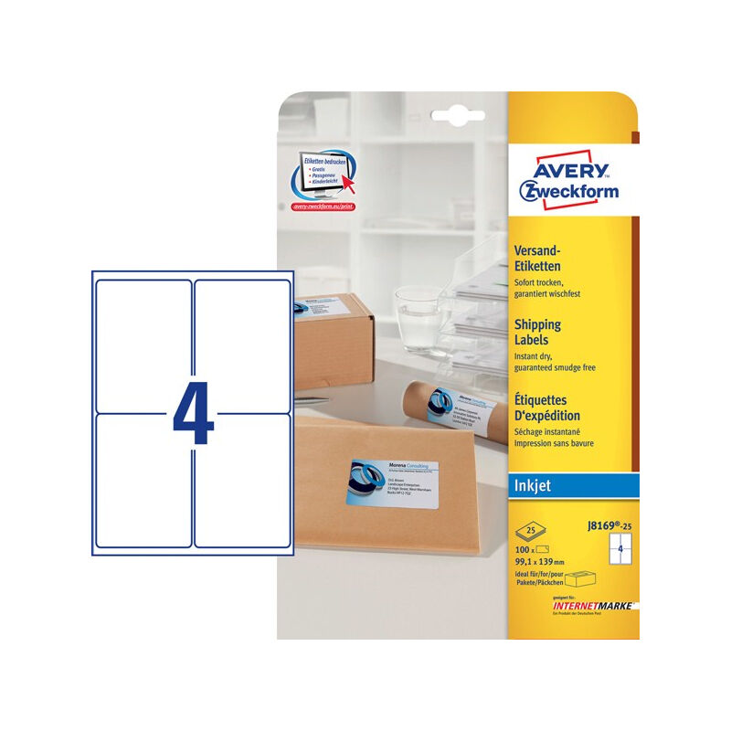 Per Natale, per il compleanno di un tuo cliente, una promozione speciale - qualsiasi sia l'occasione tu vuoi essere sicuro che i regali arriveranno e che l'etichetta applicata sul pacco rimanga perfettamente leggibile. Utilizza le etichette per indirizzi per stampanti Inkjet Avery - Non devi aspettare che l'inchiostro si asciughi perché l'asciugatura è istantanea. - L'indirizzo e il mittente si leggeranno perfettamente. - Eccezionale qualità di stampa, colori vivi e brillanti. - Ideali per etichettare pacchi. - Perfettamente compatibili con le più diffuse stampanti Laser, incluseCanon, Epson, Lexmark, Hewlett Packard e molte altre. Etichette da pacchi 100 pz Fogli per pacco 25 fogli Colore del prodotto Bianco Tecnologia di stampa Ad inchiostro Dimensione etichetta 99.1 x 139 mm Dimensioni (un foglio) A4