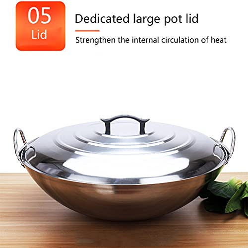 ZXFDMSWJ Wok Extra Spesso a Doppio Orecchio in Acciaio Inossidabile pentola con Coperchio Piatto 50-70 cm Fondo Tondo pentole Non magnetiche pentola pentola Senza Fumo per Piani Cottura a Gas (Argent