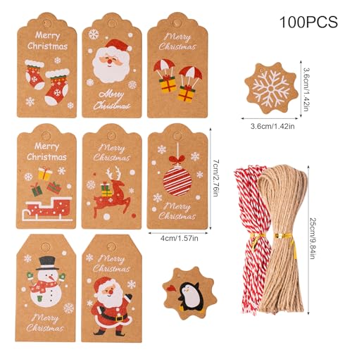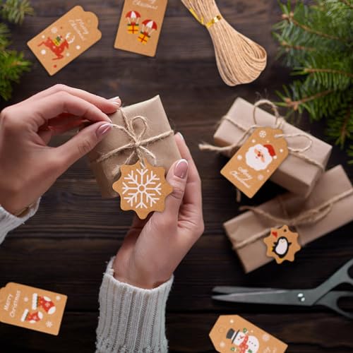 ZYDYRX 100 etichette natalizie da appendere con 4 forme Xmas marrone carta kraft etichette ciondolo con filo colorato e corda di iuta per decorazioni natalizie, artigianato C