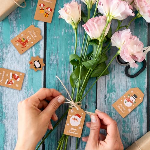 MATERIALE DI ALTA QUALITÀ: i ciondoli per regali di Natale sono realizzati in carta kraft spessa di alta qualità e vengono forniti con una quantità corrispondente di corde colorate e corde di iuta. Sono facili da usare, atossici, inodore e durevoli.