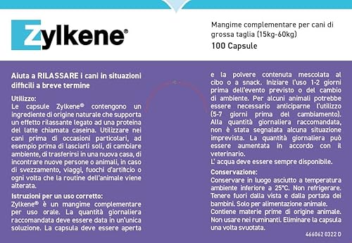 Zylkene Mangime Complementare | Cani oltre 15 kg | Rilassante per situazioni di disagio |, 100 Capsule da 450 mg