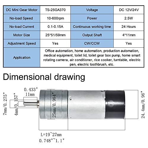 ZYuhong-Motore 25GA370H DC 12V 24 V motoriduttore, per motoriduttore per Encoder DC da 10-600RPM DIY, con Encoder a Doppio Canale, Taglia Piccola (Speed(RPM): 25rpm, Voltage(V): 12V)